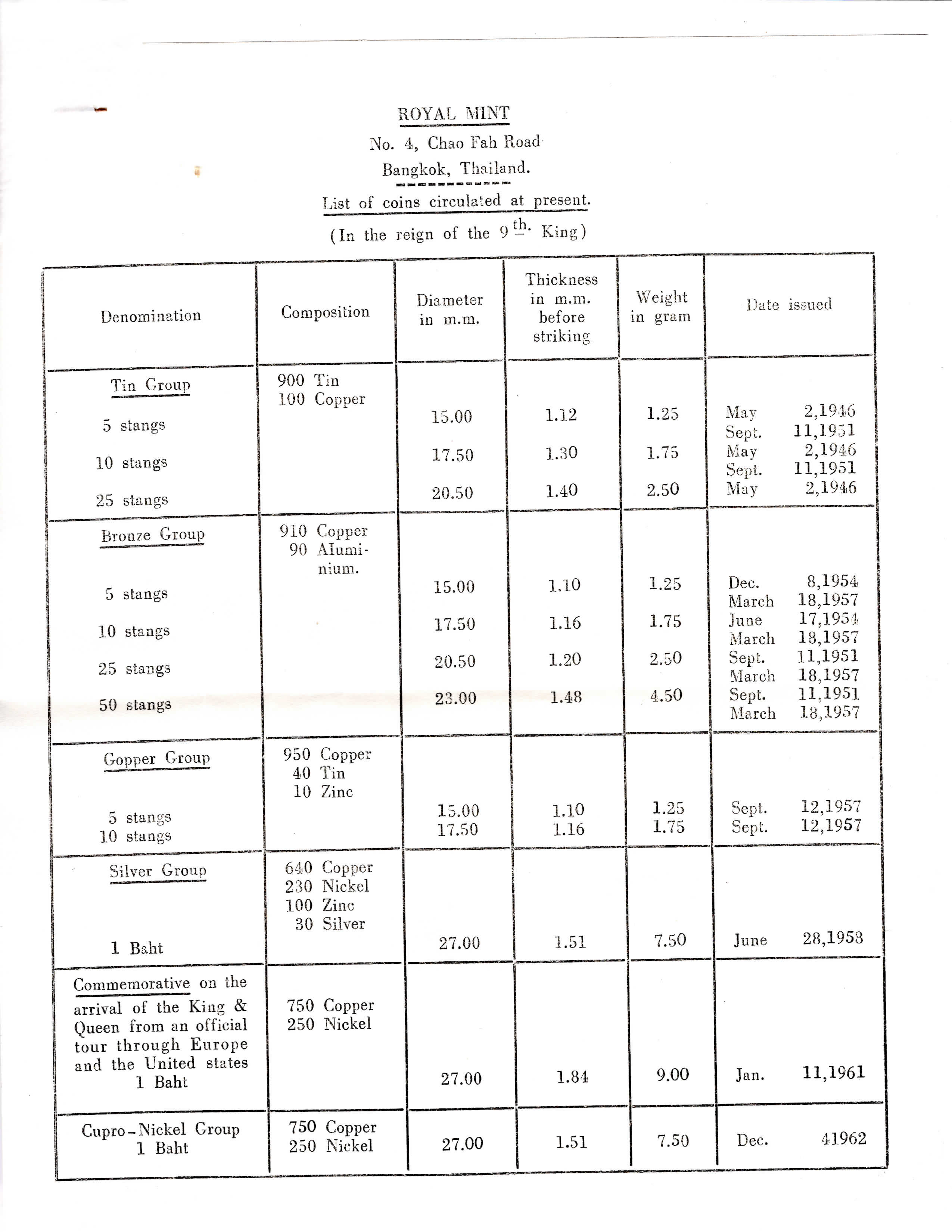This is a promotional letter for coins from the Royal Thai Mint in the 1960s. Of note is the alloy composition breakdown of the coins. Note that the "silver" 1 Baht is only 3% silver in a copper-nickel-zinc coin.